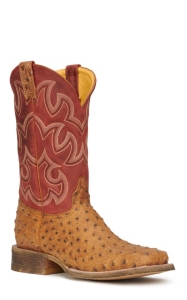 Cavender S Men S Red And Rustic Tan Ostrich Print Square Toe Cowboy Boots